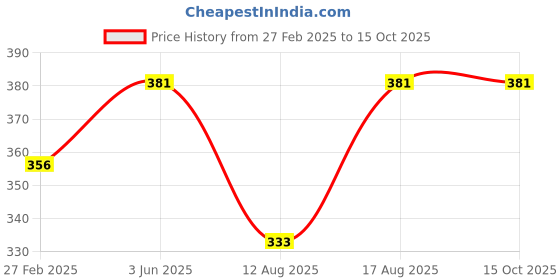 The current price is ₹381, which is ₹48 (14.4%) higher than the best price of ₹333 last seen on 12 Aug 2025. Over the 229 day price history period, prices have ranged from ₹333 to ₹381, with an average of ₹366. The pricing shows moderate volatility, but the overall trend is concerning as prices are getting more expensive. In terms of recent activity, there have been 0 price changes this week, 0 this month, and 3 over the past year. If you need this product now, it's a reasonable time to buy as prices are stable, but you might want to monitor for potential better deals.