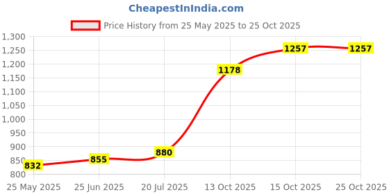 The current price is ₹1,257, which is ₹425 (51.1%) higher than the best price of ₹832 last seen on 25 May 2025. Over the 152 day price history period, prices have ranged from ₹832 to ₹1,257, with an average of ₹1,043. The pricing shows high volatility with significant fluctuations, but the overall trend is concerning as prices are getting more expensive. In terms of recent activity, there have been 0 price changes this week, 1 this month, and 4 over the past year. If you need this product now, it's a reasonable time to buy as prices are stable, but you might want to monitor for potential better deals.