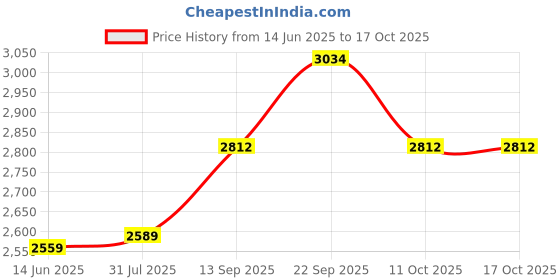 The current price is ₹2,812, which is ₹253 (9.9%) higher than the best price of ₹2,559 last seen on 14 Jun 2025. Over the 124 day price history period, prices have ranged from ₹2,559 to ₹3,034, with an average of ₹2,770. The pricing shows moderate volatility, but the overall trend is concerning as prices are getting more expensive. In terms of recent activity, there have been 0 price changes this week, 1 this month, and 4 over the past year. The price direction is uncertain, so monitor the situation for a few more days before making a decision.