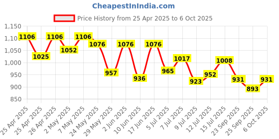 The current price is ₹931, which is ₹38 (4.3%) higher than the best price of ₹893 last seen on 25 Sep 2025. Over the 164 day price history period, prices have ranged from ₹893 to ₹1,106, with an average of ₹1,008. The pricing shows moderate volatility, and the overall trend is favorable for consumers as prices are getting cheaper. In terms of recent activity, there have been 0 price changes this week, 2 this month, and 17 over the past year. If you need this product now, it's a reasonable time to buy as prices are stable, but you might want to monitor for potential better deals.