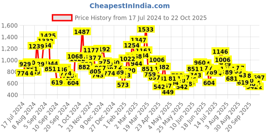 The current price is ₹697, which is ₹248 (55.2%) higher than the best price of ₹449 last seen on 3 May 2025. Over the 462 day price history period, prices have ranged from ₹449 to ₹1,533, with an average of ₹854. The pricing shows high volatility with significant fluctuations, and the overall trend is favorable for consumers as prices are getting cheaper. In terms of recent activity, there have been 0 price changes this week, 0 this month, and 77 over the past year. If you need this product now, it's a reasonable time to buy as prices are stable, but you might want to monitor for potential better deals.