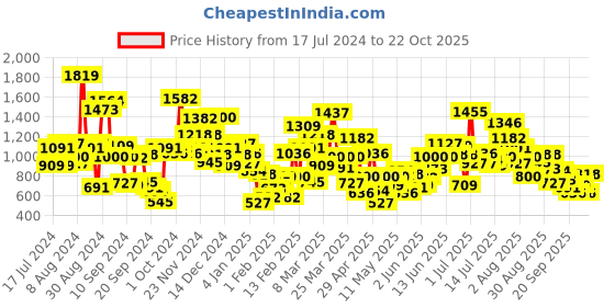 The current price is ₹818, which is ₹291 (55.2%) higher than the best price of ₹527 last seen on 14 Jan 2025. Over the 462 day price history period, prices have ranged from ₹527 to ₹1,819, with an average of ₹951. The pricing shows high volatility with significant fluctuations, and the overall trend is favorable for consumers as prices are getting cheaper. In terms of recent activity, there have been 0 price changes this week, 0 this month, and 82 over the past year. The price direction is uncertain, so monitor the situation for a few more days before making a decision.