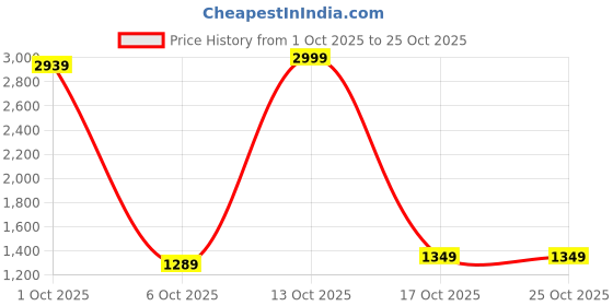 The current price is ₹1,349, which is ₹60 (4.7%) higher than the best price of ₹1,289 last seen on 6 Oct 2025. Over the 23 day price history period, prices have ranged from ₹1,289 to ₹2,999, with an average of ₹1,985. The pricing shows high volatility with significant fluctuations, and the overall trend is favorable for consumers as prices are getting cheaper. In terms of recent activity, there have been 0 price changes this week, 3 this month, and 3 over the past year. This is an excellent time to make a purchase as prices are trending downward and conditions appear favorable.
