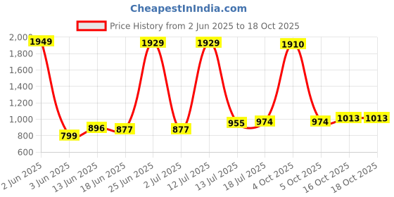 The current price is ₹1,013, which is ₹214 (26.8%) higher than the best price of ₹799 last seen on 3 Jun 2025. Over the 138 day price history period, prices have ranged from ₹799 to ₹1,949, with an average of ₹1,238. The pricing shows high volatility with significant fluctuations, and the overall trend is favorable for consumers as prices are getting cheaper. In terms of recent activity, there have been 0 price changes this week, 2 this month, and 11 over the past year. If you need this product now, it's a reasonable time to buy as prices are stable, but you might want to monitor for potential better deals.