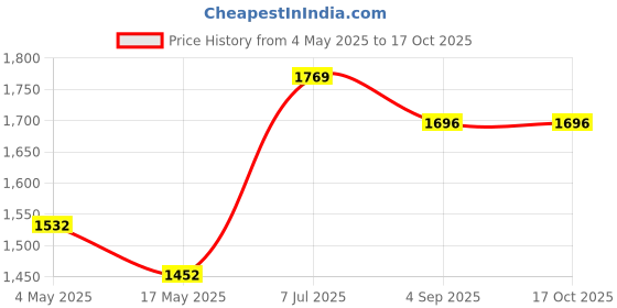 The current price is ₹1,696, which is ₹244 (16.8%) higher than the best price of ₹1,452 last seen on 17 May 2025. Over the 165 day price history period, prices have ranged from ₹1,452 to ₹1,769, with an average of ₹1,629. The pricing shows moderate volatility, but the overall trend is concerning as prices are getting more expensive. In terms of recent activity, there have been 0 price changes this week, 0 this month, and 3 over the past year. If you need this product now, it's a reasonable time to buy as prices are stable, but you might want to monitor for potential better deals.