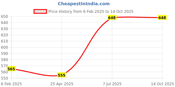 The current price is ₹648, which is ₹93 (16.8%) higher than the best price of ₹555 last seen on 25 Apr 2025. Over the 249 day price history period, prices have ranged from ₹555 to ₹648, with an average of ₹604. The pricing shows moderate volatility, but the overall trend is concerning as prices are getting more expensive. In terms of recent activity, there have been 0 price changes this week, 0 this month, and 2 over the past year. If you need this product now, it's a reasonable time to buy as prices are stable, but you might want to monitor for potential better deals.