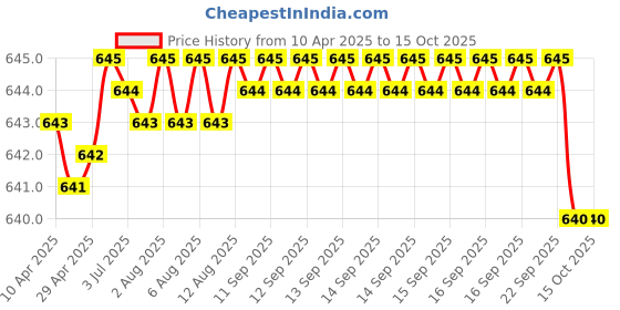 Great news for shoppers! The current price of ₹640 is at its best ever level. Over the 188 day price history period, prices have ranged from ₹640 to ₹645, with an average of ₹644. The pricing has been quite stable with low volatility, with prices remaining relatively stable overall. In terms of recent activity, there have been 0 price changes this week, 6 this month, and 29 over the past year. If you need this product now, it's a reasonable time to buy as prices are stable, but you might want to monitor for potential better deals.