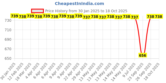 The current price is ₹738, which is ₹82 (12.5%) higher than the best price of ₹656 last seen on 23 Sep 2025. Over the 261 day price history period, prices have ranged from ₹656 to ₹739, with an average of ₹734. The pricing has been quite stable with low volatility, with prices remaining relatively stable overall. In terms of recent activity, there have been 0 price changes this week, 1 this month, and 17 over the past year. If you need this product now, it's a reasonable time to buy as prices are stable, but you might want to monitor for potential better deals.