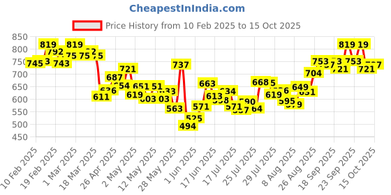 The current price is ₹737, which is ₹243 (49.2%) higher than the best price of ₹494 last seen on 29 May 2025. Over the 247 day price history period, prices have ranged from ₹494 to ₹819, with an average of ₹675. The pricing shows moderate volatility, with prices remaining relatively stable overall. In terms of recent activity, there have been 0 price changes this week, 6 this month, and 51 over the past year. If you need this product now, it's a reasonable time to buy as prices are stable, but you might want to monitor for potential better deals.