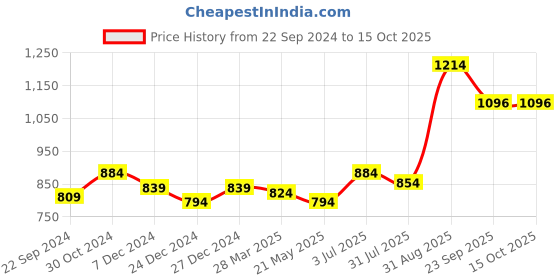 The current price is ₹1,096, which is ₹302 (38.0%) higher than the best price of ₹794 last seen on 24 Dec 2024. Over the 388 day price history period, prices have ranged from ₹794 to ₹1,214, with an average of ₹911. The pricing shows moderate volatility, but the overall trend is concerning as prices are getting more expensive. In terms of recent activity, there have been 0 price changes this week, 0 this month, and 9 over the past year. The price direction is uncertain, so monitor the situation for a few more days before making a decision.
