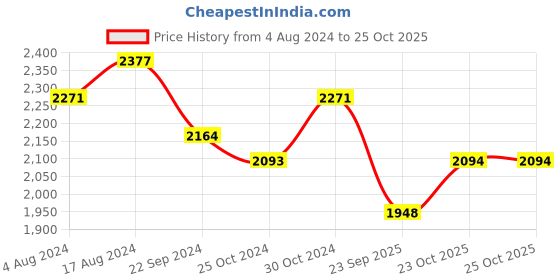 The current price is ₹2,094, which is ₹146 (7.5%) higher than the best price of ₹1,948 last seen on 23 Sep 2025. Over the 446 day price history period, prices have ranged from ₹1,948 to ₹2,377, with an average of ₹2,164. The pricing shows moderate volatility, and the overall trend is favorable for consumers as prices are getting cheaper. In terms of recent activity, there have been 0 price changes this week, 0 this month, and 3 over the past year. The price direction is uncertain, so monitor the situation for a few more days before making a decision.