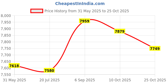 The current price is ₹7,879, which is ₹299 (3.9%) higher than the best price of ₹7,580 last seen on 20 Jul 2025. Over the 146 day price history period, prices have ranged from ₹7,580 to ₹7,959, with an average of ₹7,783. The pricing has been quite stable with low volatility, with prices remaining relatively stable overall. In terms of recent activity, there have been 0 price changes this week, 0 this month, and 3 over the past year. If you need this product now, it's a reasonable time to buy as prices are stable, but you might want to monitor for potential better deals.