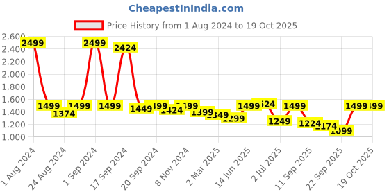 The current price is ₹1,499, which is ₹400 (36.4%) higher than the best price of ₹1,099 last seen on 22 Sep 2025. Over the 443 day price history period, prices have ranged from ₹1,099 to ₹2,499, with an average of ₹1,542. The pricing shows high volatility with significant fluctuations, and the overall trend is favorable for consumers as prices are getting cheaper. In terms of recent activity, there have been 0 price changes this week, 2 this month, and 11 over the past year. The price direction is uncertain, so monitor the situation for a few more days before making a decision.