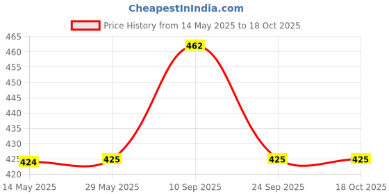The current price is ₹425, which is ₹0.2 (0.0%) higher than the best price of ₹424.8 last seen on 14 May 2025. Over the 157 day price history period, prices have ranged from ₹424.8 to ₹462, with an average of ₹432. The pricing has been quite stable with low volatility, with prices remaining relatively stable overall. In terms of recent activity, there have been 0 price changes this week, 0 this month, and 3 over the past year. If you need this product now, it's a reasonable time to buy as prices are stable, but you might want to monitor for potential better deals.