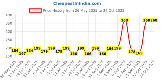 The current price is ₹368, which is ₹202 (121.7%) higher than the best price of ₹166 last seen on 24 Jul 2025. Over the 151 day price history period, prices have ranged from ₹166 to ₹368, with an average of ₹212. The pricing shows high volatility with significant fluctuations, but the overall trend is concerning as prices are getting more expensive. In terms of recent activity, there have been 0 price changes this week, 0 this month, and 18 over the past year. Consider waiting before making a purchase as prices are rising and better deals may be available later.