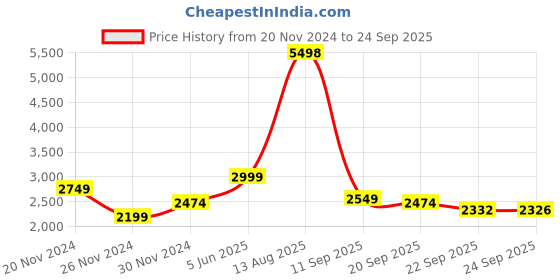The current price is ₹2,326, which is ₹127 (5.8%) higher than the best price of ₹2,199 last seen on 26 Nov 2024. Over the 308 day price history period, prices have ranged from ₹2,199 to ₹5,498, with an average of ₹2,844. The pricing shows high volatility with significant fluctuations, and the overall trend is favorable for consumers as prices are getting cheaper. In terms of recent activity, there have been 0 price changes this week, 0 this month, and 8 over the past year. This is an excellent time to make a purchase as prices are trending downward and conditions appear favorable.