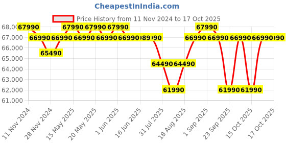 The current price is ₹66,990, which is ₹5,000 (8.1%) higher than the best price of ₹61,990 last seen on 12 Aug 2025. Over the 339 day price history period, prices have ranged from ₹61,990 to ₹67,990, with an average of ₹66,273. The pricing has been quite stable with low volatility, with prices remaining relatively stable overall. In terms of recent activity, there has been 1 price change this week, 4 this month, and 21 over the past year. The price direction is uncertain, so monitor the situation for a few more days before making a decision.
