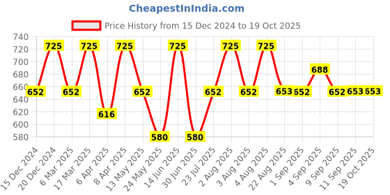 The current price is ₹653, which is ₹73 (12.6%) higher than the best price of ₹580 last seen on 24 May 2025. Over the 307 day price history period, prices have ranged from ₹580 to ₹725, with an average of ₹667. The pricing shows moderate volatility, with prices remaining relatively stable overall. In terms of recent activity, there have been 0 price changes this week, 0 this month, and 18 over the past year. If you need this product now, it's a reasonable time to buy as prices are stable, but you might want to monitor for potential better deals.