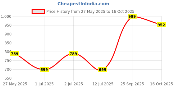 The current price is ₹952, which is ₹253 (36.2%) higher than the best price of ₹699 last seen on 1 Jul 2025. Over the 142 day price history period, prices have ranged from ₹699 to ₹999, with an average of ₹821. The pricing shows moderate volatility, but the overall trend is concerning as prices are getting more expensive. In terms of recent activity, there have been 0 price changes this week, 1 this month, and 5 over the past year. Consider waiting before making a purchase as prices are rising and better deals may be available later.