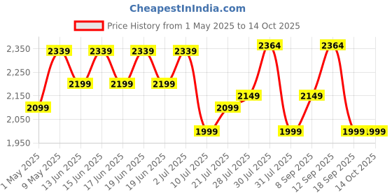 Awesome! The current price of ₹1,999 is at its best ever level. Over the 165 day price history period, prices have ranged from ₹1,999 to ₹2,364, with an average of ₹2,187. The pricing shows moderate volatility, with prices remaining relatively stable overall. In terms of recent activity, there have been 0 price changes this week, 0 this month, and 15 over the past year. The price direction is uncertain, so monitor the situation for a few more days before making a decision.