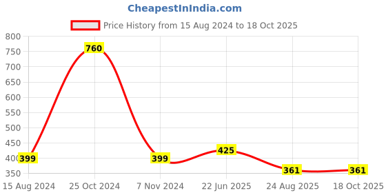 Awesome! The current price of ₹361 is at its best ever level. Over the 429 day price history period, prices have ranged from ₹361 to ₹760, with an average of ₹451. The pricing shows high volatility with significant fluctuations, and the overall trend is favorable for consumers as prices are getting cheaper. In terms of recent activity, there have been 0 price changes this week, 0 this month, and 3 over the past year. If you need this product now, it's a reasonable time to buy as prices are stable, but you might want to monitor for potential better deals.