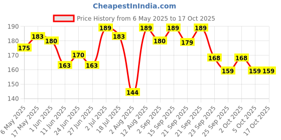 The current price is ₹159, which is ₹15 (10.4%) higher than the best price of ₹144 last seen on 2 Aug 2025. Over the 163 day price history period, prices have ranged from ₹144 to ₹189, with an average of ₹173. The pricing shows moderate volatility, and the overall trend is favorable for consumers as prices are getting cheaper. In terms of recent activity, there have been 0 price changes this week, 5 this month, and 17 over the past year. If you need this product now, it's a reasonable time to buy as prices are stable, but you might want to monitor for potential better deals.