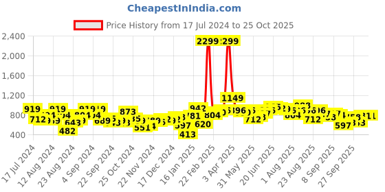 The current price is ₹781, which is ₹368 (89.1%) higher than the best price of ₹413 last seen on 10 Jan 2025. Over the 464 day price history period, prices have ranged from ₹413 to ₹2,299, with an average of ₹819. The pricing shows high volatility with significant fluctuations, and the overall trend is favorable for consumers as prices are getting cheaper. In terms of recent activity, there have been 0 price changes this week, 2 this month, and 46 over the past year. The price direction is uncertain, so monitor the situation for a few more days before making a decision.