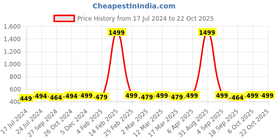 The current price is ₹499, which is ₹50 (11.1%) higher than the best price of ₹449 last seen on 17 Jul 2024. Over the 461 day price history period, prices have ranged from ₹449 to ₹1,499, with an average of ₹605. The pricing shows high volatility with significant fluctuations, but the overall trend is concerning as prices are getting more expensive. In terms of recent activity, there have been 0 price changes this week, 0 this month, and 12 over the past year. If you need this product now, it's a reasonable time to buy as prices are stable, but you might want to monitor for potential better deals.