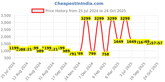 The current price is ₹1,557, which is ₹799 (105.4%) higher than the best price of ₹758 last seen on 6 Feb 2025. Over the 456 day price history period, prices have ranged from ₹758 to ₹3,299, with an average of ₹1,571. The pricing shows high volatility with significant fluctuations, but the overall trend is concerning as prices are getting more expensive. In terms of recent activity, there have been 0 price changes this week, 0 this month, and 12 over the past year. If you need this product now, it's a reasonable time to buy as prices are stable, but you might want to monitor for potential better deals.