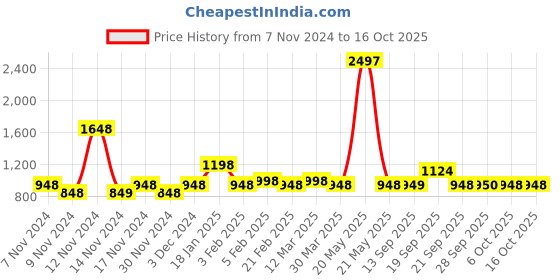 The current price is ₹948, which is ₹100 (11.8%) higher than the best price of ₹848 last seen on 9 Nov 2024. Over the 342 day price history period, prices have ranged from ₹848 to ₹2,497.5, with an average of ₹1,066. The pricing shows high volatility with significant fluctuations, with prices remaining relatively stable overall. In terms of recent activity, there have been 0 price changes this week, 3 this month, and 19 over the past year. If you need this product now, it's a reasonable time to buy as prices are stable, but you might want to monitor for potential better deals.