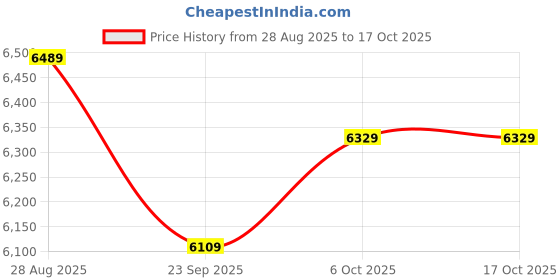 The current price is ₹6,329, which is ₹220 (3.6%) higher than the best price of ₹6,109 last seen on 23 Sep 2025. Over the 49 day price history period, prices have ranged from ₹6,109 to ₹6,489, with an average of ₹6,314. The pricing has been quite stable with low volatility, with prices remaining relatively stable overall. In terms of recent activity, there have been 0 price changes this week, 1 this month, and 2 over the past year. The price direction is uncertain, so monitor the situation for a few more days before making a decision.