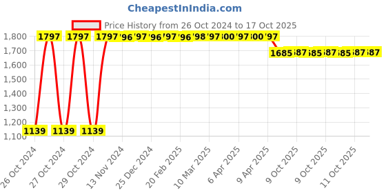 The current price is ₹1,687, which is ₹548 (48.1%) higher than the best price of ₹1,139 last seen on 26 Oct 2024. Over the 355 day price history period, prices have ranged from ₹1,139 to ₹1,800, with an average of ₹1,683. The pricing shows moderate volatility, but the overall trend is concerning as prices are getting more expensive. In terms of recent activity, there have been 0 price changes this week, 5 this month, and 22 over the past year. If you need this product now, it's a reasonable time to buy as prices are stable, but you might want to monitor for potential better deals.