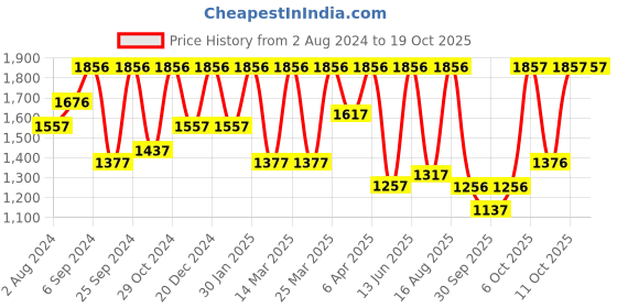 The current price is ₹1,857, which is ₹720 (63.3%) higher than the best price of ₹1,137 last seen on 30 Sep 2025. Over the 442 day price history period, prices have ranged from ₹1,137 to ₹1,857, with an average of ₹1,617. The pricing shows high volatility with significant fluctuations, but the overall trend is concerning as prices are getting more expensive. In terms of recent activity, there have been 0 price changes this week, 5 this month, and 21 over the past year. Consider waiting before making a purchase as prices are rising and better deals may be available later.