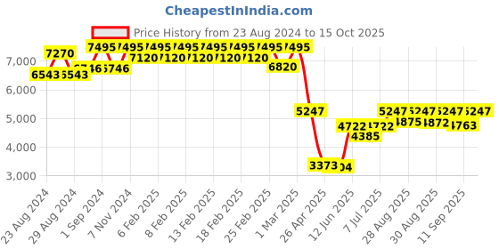 The current price is ₹5,247, which is ₹1,943 (58.8%) higher than the best price of ₹3,304 last seen on 28 Apr 2025. Over the 418 day price history period, prices have ranged from ₹3,304 to ₹7,495, with an average of ₹6,171. The pricing shows high volatility with significant fluctuations, and the overall trend is favorable for consumers as prices are getting cheaper. In terms of recent activity, there have been 0 price changes this week, 0 this month, and 25 over the past year. If you need this product now, it's a reasonable time to buy as prices are stable, but you might want to monitor for potential better deals.