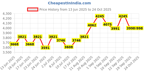 The current price is ₹3,998, which is ₹407 (11.3%) higher than the best price of ₹3,591 last seen on 24 Jun 2025. Over the 133 day price history period, prices have ranged from ₹3,591 to ₹4,245, with an average of ₹3,878. The pricing shows moderate volatility, but the overall trend is concerning as prices are getting more expensive. In terms of recent activity, there have been 0 price changes this week, 0 this month, and 15 over the past year. The price direction is uncertain, so monitor the situation for a few more days before making a decision.