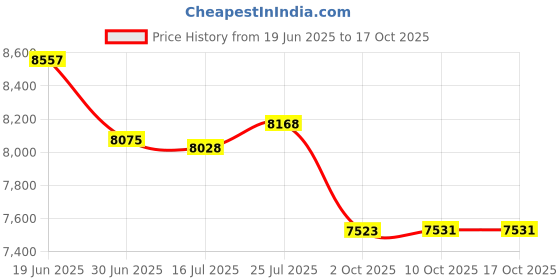 The current price is ₹7,531, which is ₹8 (0.1%) higher than the best price of ₹7,523 last seen on 2 Oct 2025. Over the 119 day price history period, prices have ranged from ₹7,523 to ₹8,557, with an average of ₹7,916. The pricing has been quite stable with low volatility, and the overall trend is favorable for consumers as prices are getting cheaper. In terms of recent activity, there have been 0 price changes this week, 1 this month, and 5 over the past year. If you need this product now, it's a reasonable time to buy as prices are stable, but you might want to monitor for potential better deals.