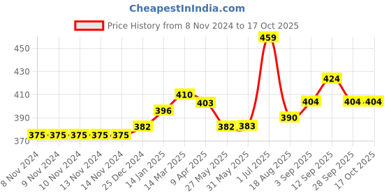 The current price is ₹404, which is ₹29 (7.7%) higher than the best price of ₹375 last seen on 9 Nov 2024. Over the 342 day price history period, prices have ranged from ₹375 to ₹459, with an average of ₹395. The pricing shows moderate volatility, but the overall trend is concerning as prices are getting more expensive. In terms of recent activity, there have been 0 price changes this week, 0 this month, and 15 over the past year. If you need this product now, it's a reasonable time to buy as prices are stable, but you might want to monitor for potential better deals.