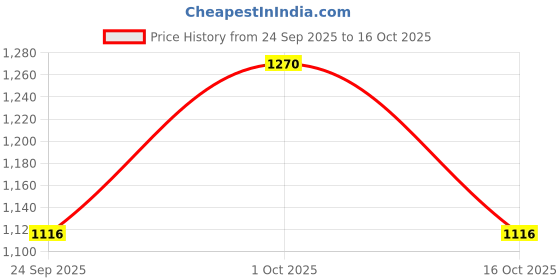 Exciting update! The current price of ₹1,116 is at its best ever level. Over the 22 day price history period, prices have ranged from ₹1,116 to ₹1,270, with an average of ₹1,167. The pricing shows moderate volatility, with prices remaining relatively stable overall. In terms of recent activity, there have been 0 price changes this week, 2 this month, and 2 over the past year. If you need this product now, it's a reasonable time to buy as prices are stable, but you might want to monitor for potential better deals.