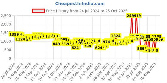 The current price is ₹1,109, which is ₹650 (141.6%) higher than the best price of ₹459 last seen on 29 Aug 2025. Over the 457 day price history period, prices have ranged from ₹459 to ₹2,499, with an average of ₹1,050. The pricing shows high volatility with significant fluctuations, and the overall trend is favorable for consumers as prices are getting cheaper. In terms of recent activity, there have been 0 price changes this week, 0 this month, and 60 over the past year. This is an excellent time to make a purchase as prices are trending downward and conditions appear favorable.