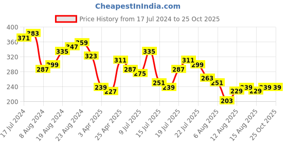 The current price is ₹239, which is ₹36 (17.7%) higher than the best price of ₹203 last seen on 12 Aug 2025. Over the 464 day price history period, prices have ranged from ₹203 to ₹383, with an average of ₹284. The pricing shows high volatility with significant fluctuations, and the overall trend is favorable for consumers as prices are getting cheaper. In terms of recent activity, there have been 0 price changes this week, 0 this month, and 18 over the past year. If you need this product now, it's a reasonable time to buy as prices are stable, but you might want to monitor for potential better deals.