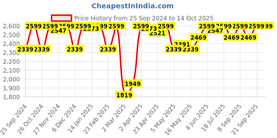 The current price is ₹2,599, which is ₹780 (42.9%) higher than the best price of ₹1,819 last seen on 2 Mar 2025. Over the 383 day price history period, prices have ranged from ₹1,819 to ₹2,599, with an average of ₹2,472. The pricing shows moderate volatility, but the overall trend is concerning as prices are getting more expensive. In terms of recent activity, there have been 0 price changes this week, 1 this month, and 26 over the past year. Consider waiting before making a purchase as prices are rising and better deals may be available later.