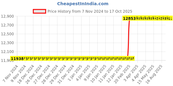 The current price is ₹12,851, which is ₹914 (7.7%) higher than the best price of ₹11,937 last seen on 8 Nov 2024. Over the 343 day price history period, prices have ranged from ₹11,937 to ₹12,855, with an average of ₹12,169. The pricing has been quite stable with low volatility, but the overall trend is concerning as prices are getting more expensive. In terms of recent activity, there have been 0 price changes this week, 0 this month, and 73 over the past year. If you need this product now, it's a reasonable time to buy as prices are stable, but you might want to monitor for potential better deals.
