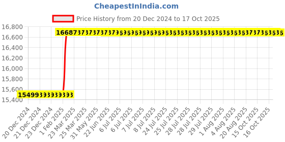 The current price is ₹16,688, which is ₹1,190 (7.7%) higher than the best price of ₹15,498 last seen on 20 Dec 2024. Over the 300 day price history period, prices have ranged from ₹15,498 to ₹16,689, with an average of ₹16,502. The pricing has been quite stable with low volatility, but the overall trend is concerning as prices are getting more expensive. In terms of recent activity, there have been 3 price changes this week, 3 this month, and 63 over the past year. If you need this product now, it's a reasonable time to buy as prices are stable, but you might want to monitor for potential better deals.
