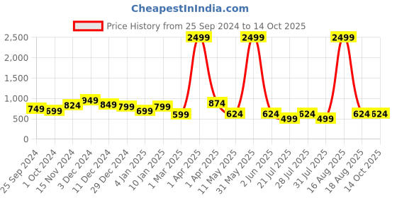 The current price is ₹624, which is ₹125 (25.1%) higher than the best price of ₹499 last seen on 21 Jul 2025. Over the 383 day price history period, prices have ranged from ₹499 to ₹2,499, with an average of ₹973. The pricing shows high volatility with significant fluctuations, and the overall trend is favorable for consumers as prices are getting cheaper. In terms of recent activity, there have been 0 price changes this week, 0 this month, and 16 over the past year. This is an excellent time to make a purchase as prices are trending downward and conditions appear favorable.