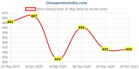 The current price is ₹433, which is ₹10 (2.4%) higher than the best price of ₹423 last seen on 8 Sep 2025. Over the 146 day price history period, prices have ranged from ₹423 to ₹467, with an average of ₹445. The pricing has been quite stable with low volatility, and the overall trend is favorable for consumers as prices are getting cheaper. In terms of recent activity, there have been 0 price changes this week, 0 this month, and 4 over the past year. If you need this product now, it's a reasonable time to buy as prices are stable, but you might want to monitor for potential better deals.