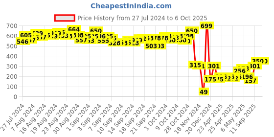 The current price is ₹350, which is ₹301 (614.3%) higher than the best price of ₹49 last seen on 3 Dec 2024. Over the 435 day price history period, prices have ranged from ₹49 to ₹699, with an average of ₹487. The pricing shows high volatility with significant fluctuations, and the overall trend is favorable for consumers as prices are getting cheaper. In terms of recent activity, there have been 0 price changes this week, 1 this month, and 24 over the past year. If you need this product now, it's a reasonable time to buy as prices are stable, but you might want to monitor for potential better deals.