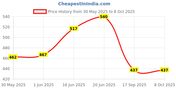 Great news for shoppers! The current price of ₹437 is at its best ever level. Over the 130 day price history period, prices have ranged from ₹437 to ₹540, with an average of ₹477. The pricing shows moderate volatility, and the overall trend is favorable for consumers as prices are getting cheaper. In terms of recent activity, there have been 0 price changes this week, 0 this month, and 4 over the past year. This is an excellent time to make a purchase as prices are trending downward and conditions appear favorable.