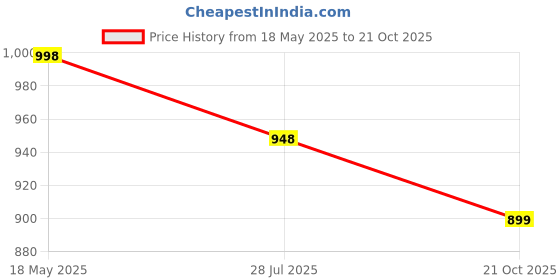 Exciting update! The current price of ₹899 is at its best ever level. Over the 156 day price history period, prices have ranged from ₹899 to ₹998, with an average of ₹948. The pricing has been quite stable with low volatility, and the overall trend is favorable for consumers as prices are getting cheaper. In terms of recent activity, there have been 0 price changes this week, 0 this month, and 2 over the past year. If you need this product now, it's a reasonable time to buy as prices are stable, but you might want to monitor for potential better deals.