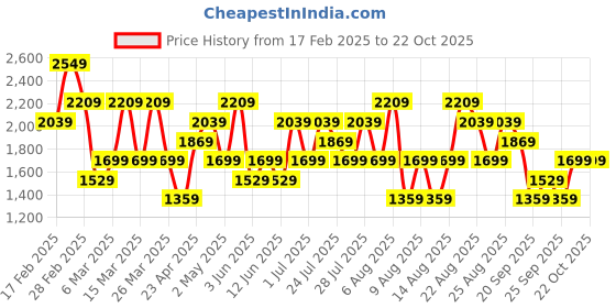 The current price is ₹1,699, which is ₹340 (25.0%) higher than the best price of ₹1,359 last seen on 6 Apr 2025. Over the 246 day price history period, prices have ranged from ₹1,359 to ₹2,549, with an average of ₹1,812. The pricing shows high volatility with significant fluctuations, and the overall trend is favorable for consumers as prices are getting cheaper. In terms of recent activity, there have been 0 price changes this week, 2 this month, and 37 over the past year. The price direction is uncertain, so monitor the situation for a few more days before making a decision.