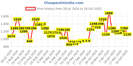 The current price is ₹1,120, which is ₹266 (31.1%) higher than the best price of ₹854 last seen on 13 Sep 2024. Over the 445 day price history period, prices have ranged from ₹854 to ₹1,680, with an average of ₹1,202. The pricing shows high volatility with significant fluctuations, with prices remaining relatively stable overall. In terms of recent activity, there have been 0 price changes this week, 0 this month, and 10 over the past year. If you need this product now, it's a reasonable time to buy as prices are stable, but you might want to monitor for potential better deals.